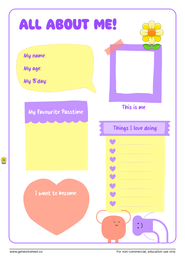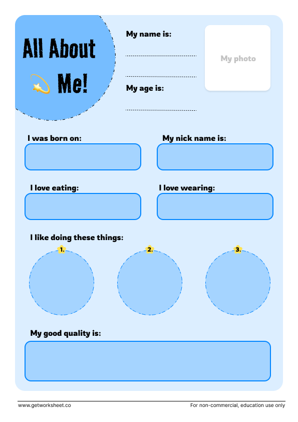 All About Me worksheets are a classroom staple for good reason — they give students a structured, low-pressure way to introduce themselves at the beginning of the year, practice writing skills, and build classroom community. Kids fill in their name, age, favorite things, family details, and what makes them unique. It's part ice-breaker, part writing exercise, and part self-reflection activity.