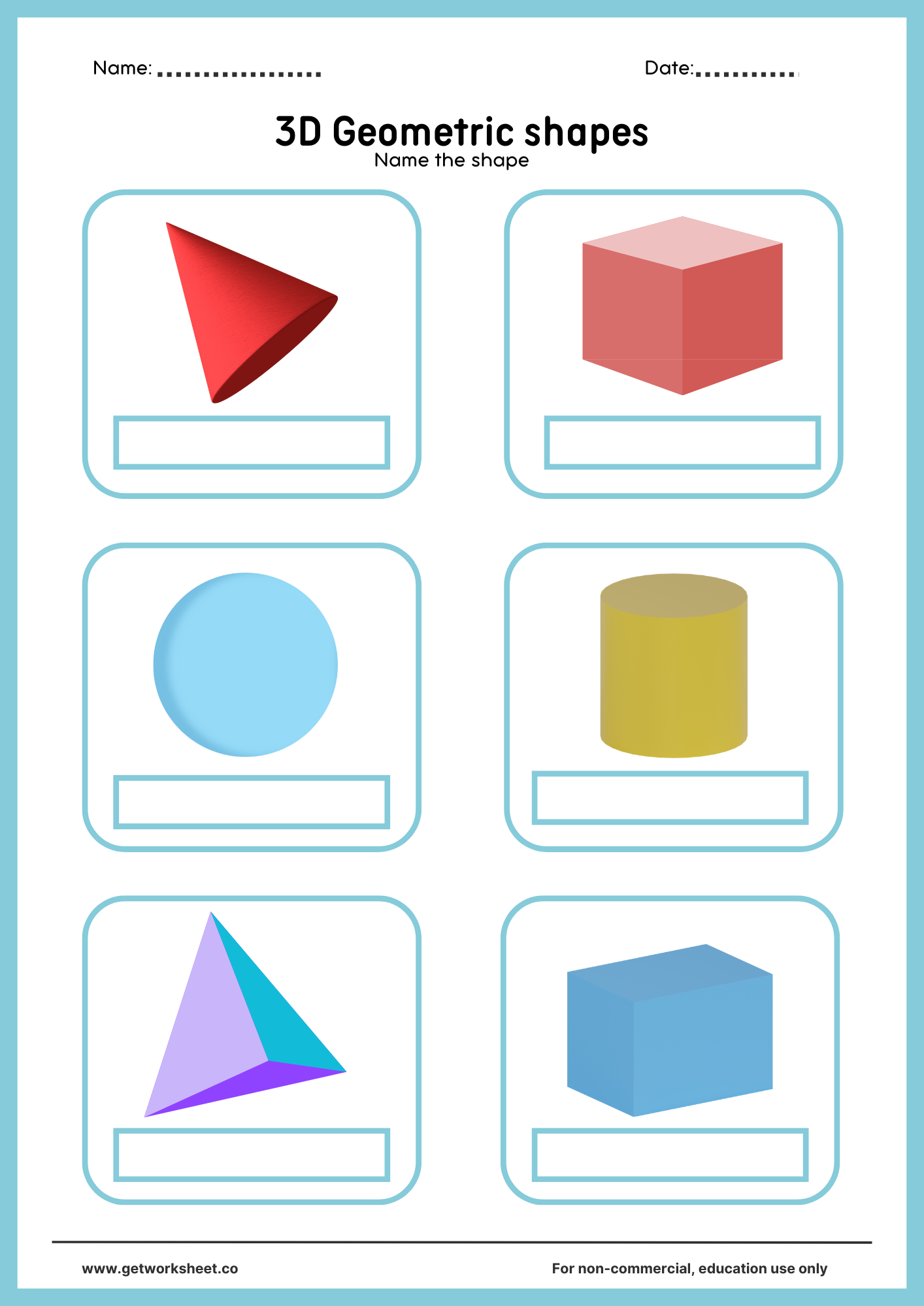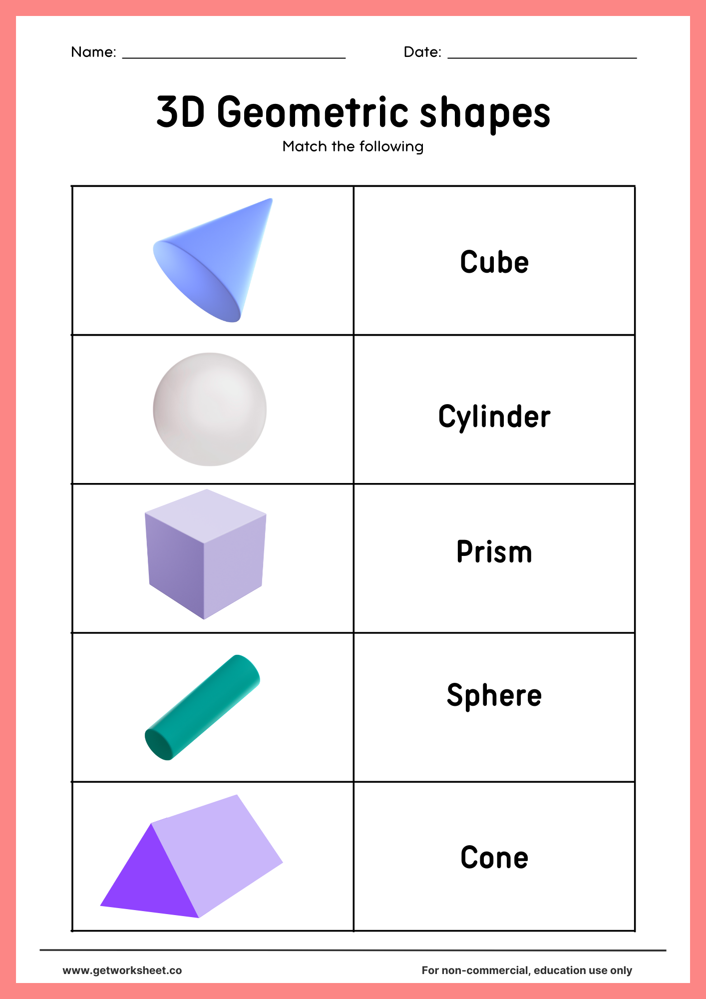Free 3D shapes worksheets with answer keys. Practice identifying cubes, spheres, cones, cylinders, and prisms — printable PDFs for grades K-4 math.