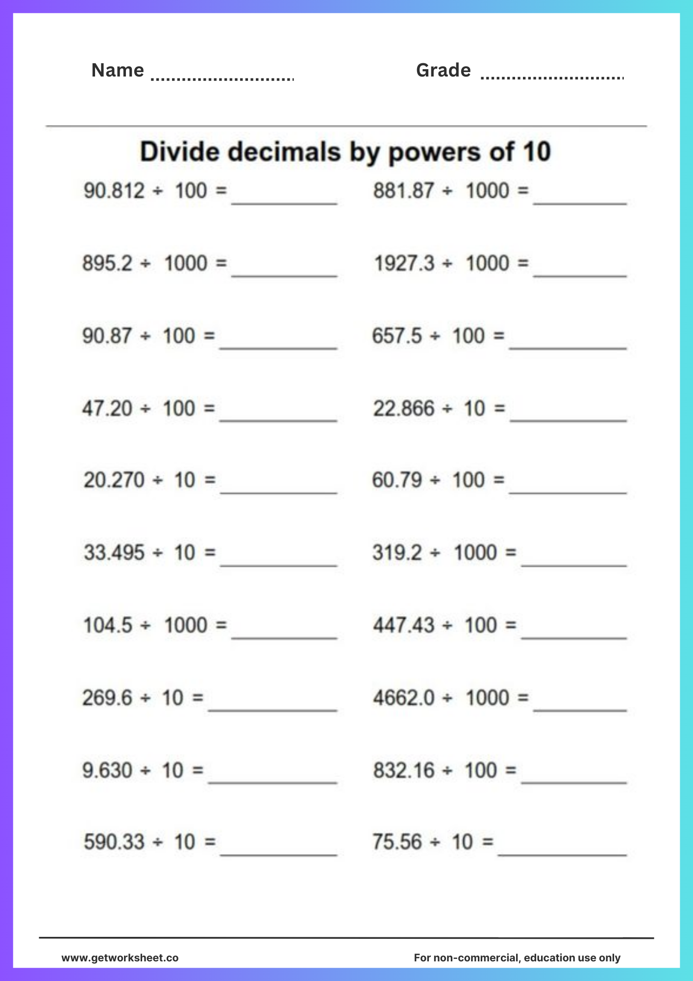 Decimal division worksheet 1