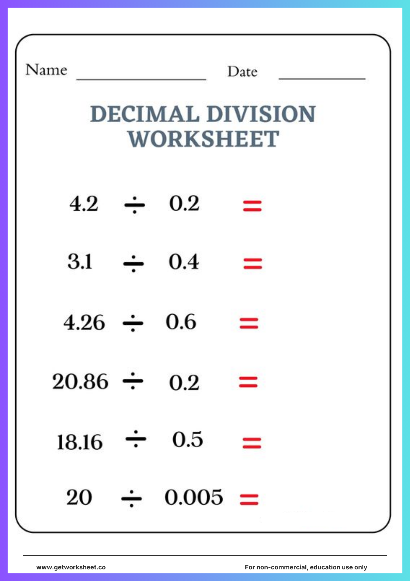 Free printable decimal division worksheets with answer keys. Practice dividing decimals by whole numbers and decimals. PDF download for grades 4-6.